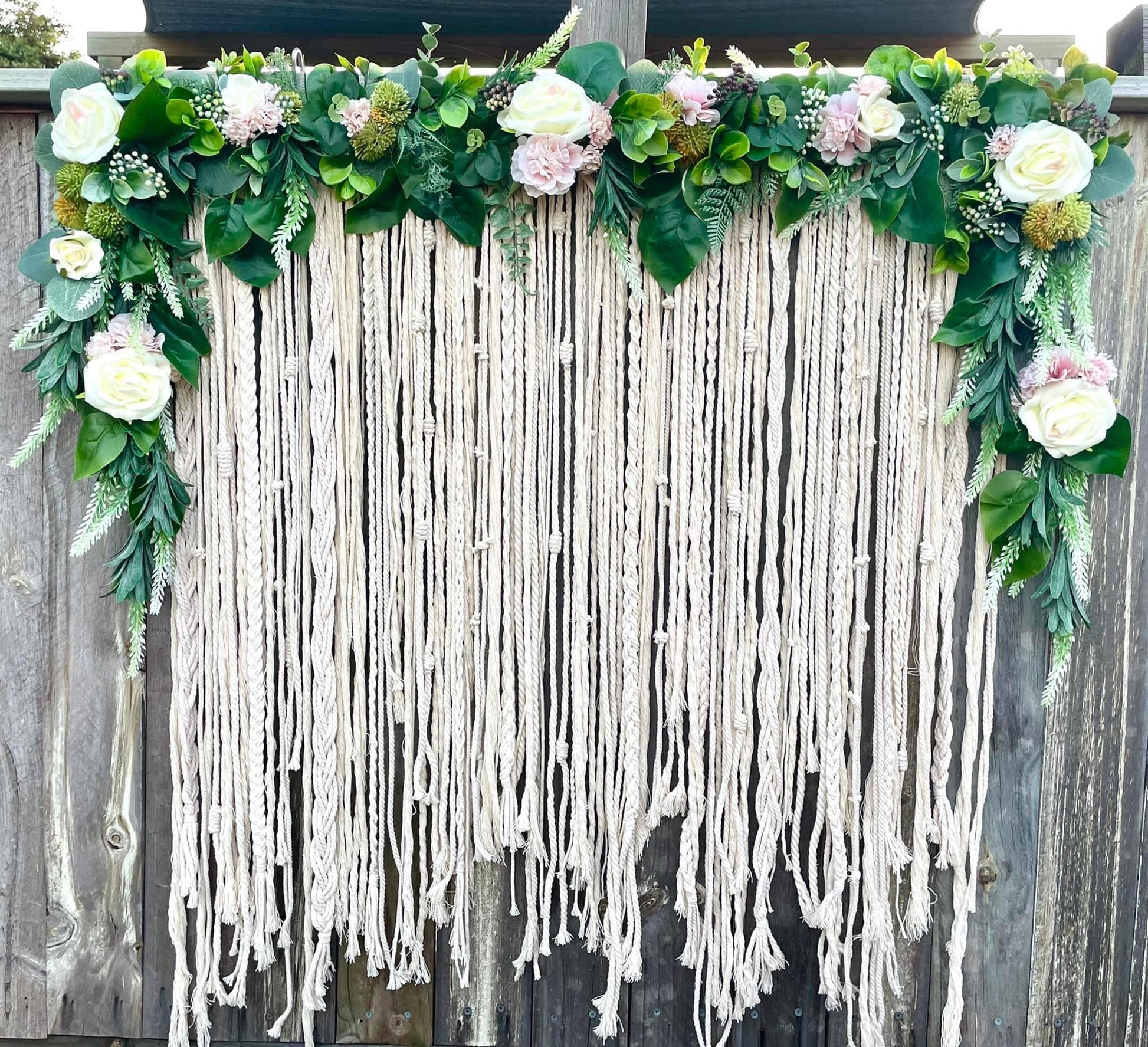 Macrame wall hanging with artificial flowers and greenery.
