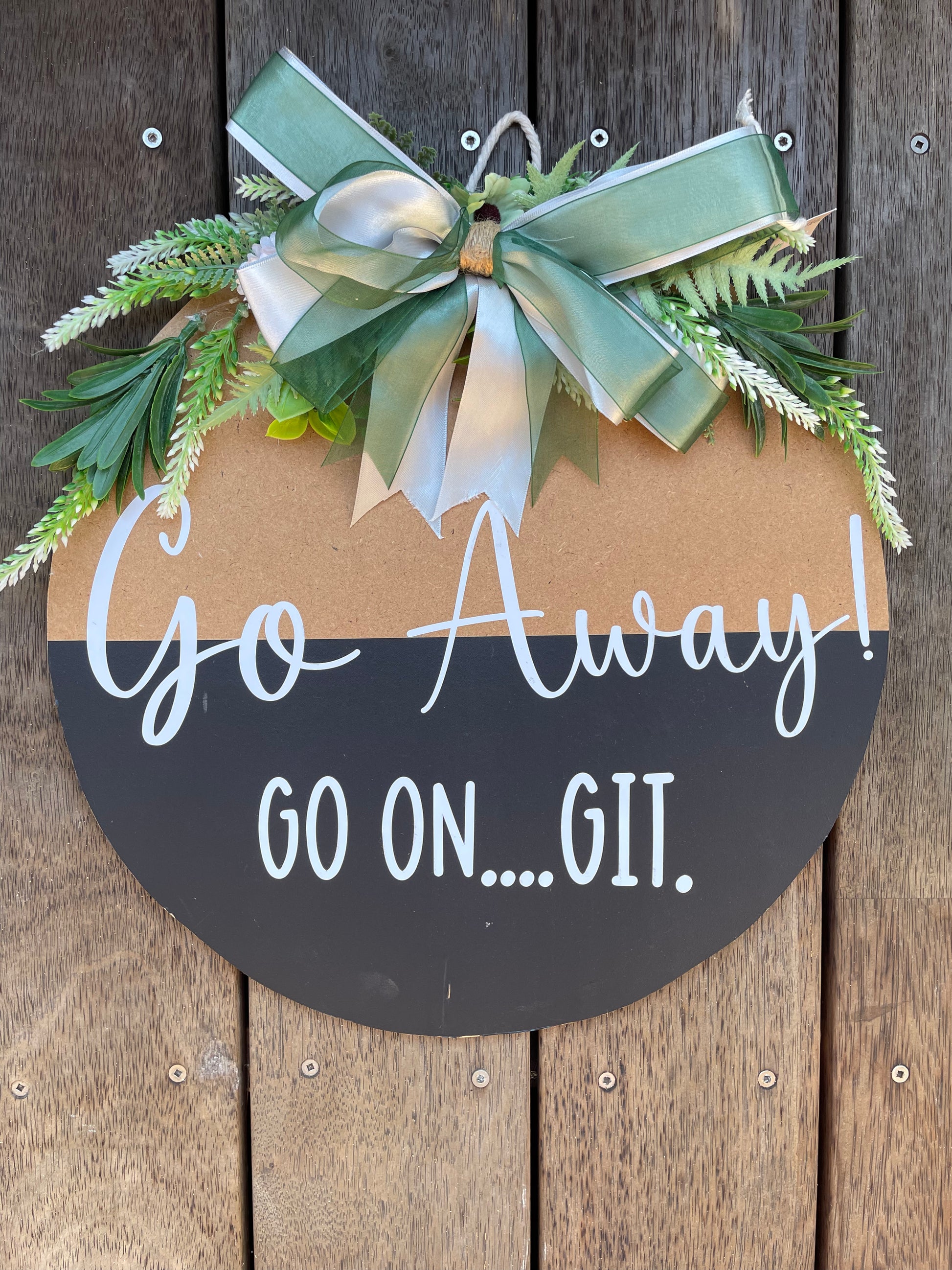 "Go Away ! Go on Git " door sign with ribbons and artificial greenery